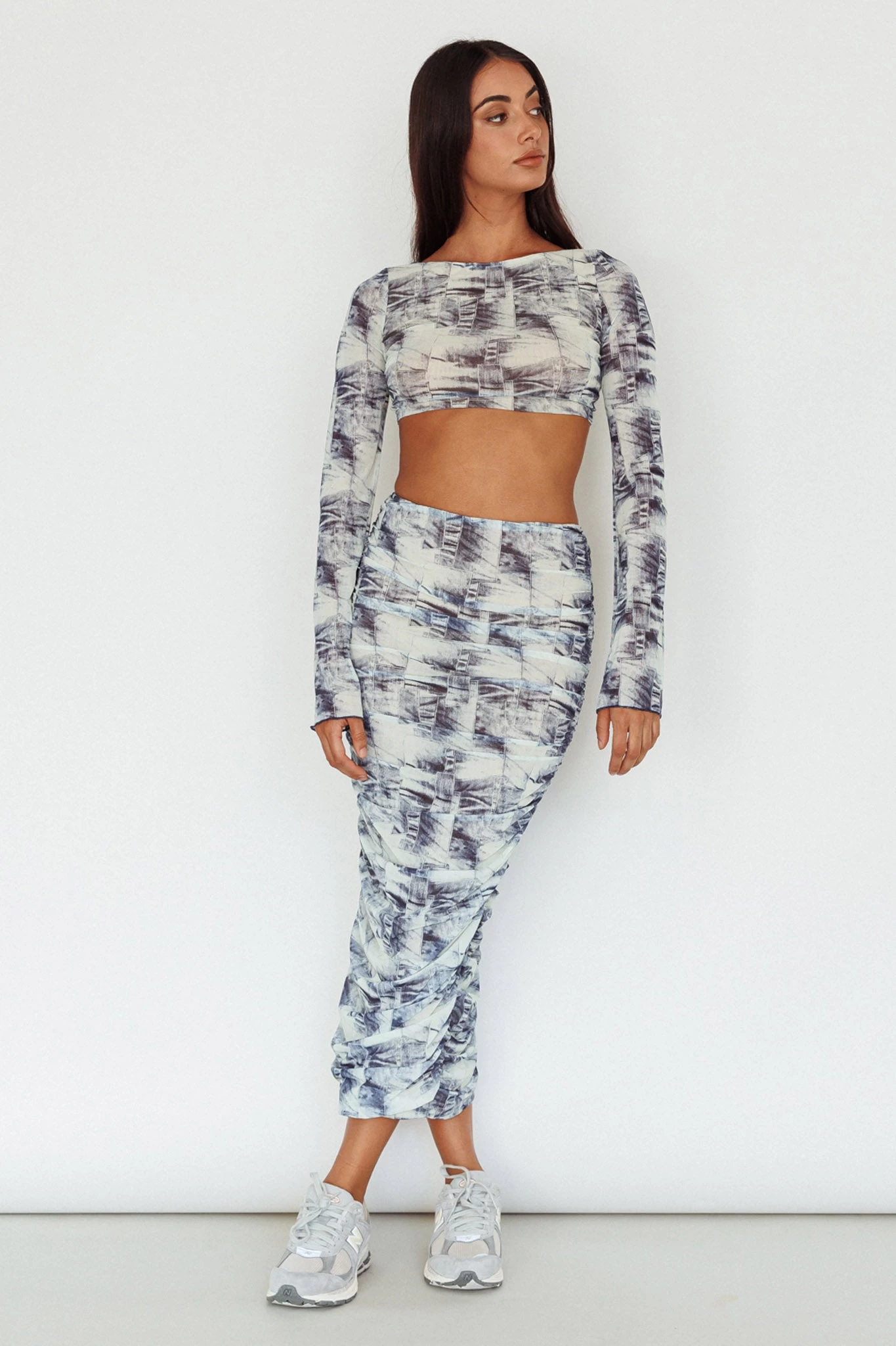 You will stop traffic in our super hot Blue Moons midi skirt. We are in love with its trendy print and ruching detail to accentuate your curves. Perfect for Friday night at your fave rooftop teamed with its matching crop top and boots.