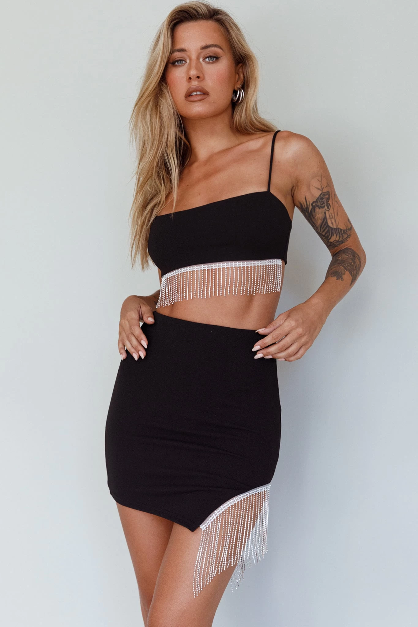 Heads will turn when you walk in wearing our hot Call On Me mini skirt. We are obsessed with its diamante fringe detail in the hem! Perfect for a girls’ night out or birthday celebration. Team it with its matching crop top and diamante heels for a look that won’t be forgotten!