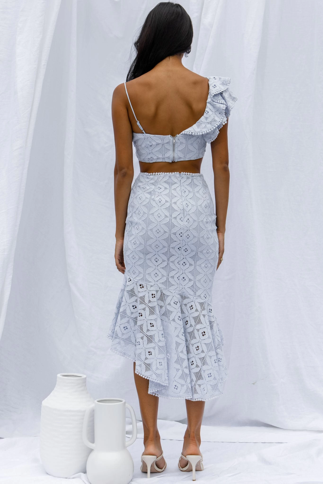 You’ll be the talk of the town in this gorgeous midi skirt. We are obsessed with its lace fabric throughout, not to mention the super cute circle trim and the cascading ruffle hem. Perfect for weekend brunches with bae teamed with its matching crop top, tan mules and a tote.