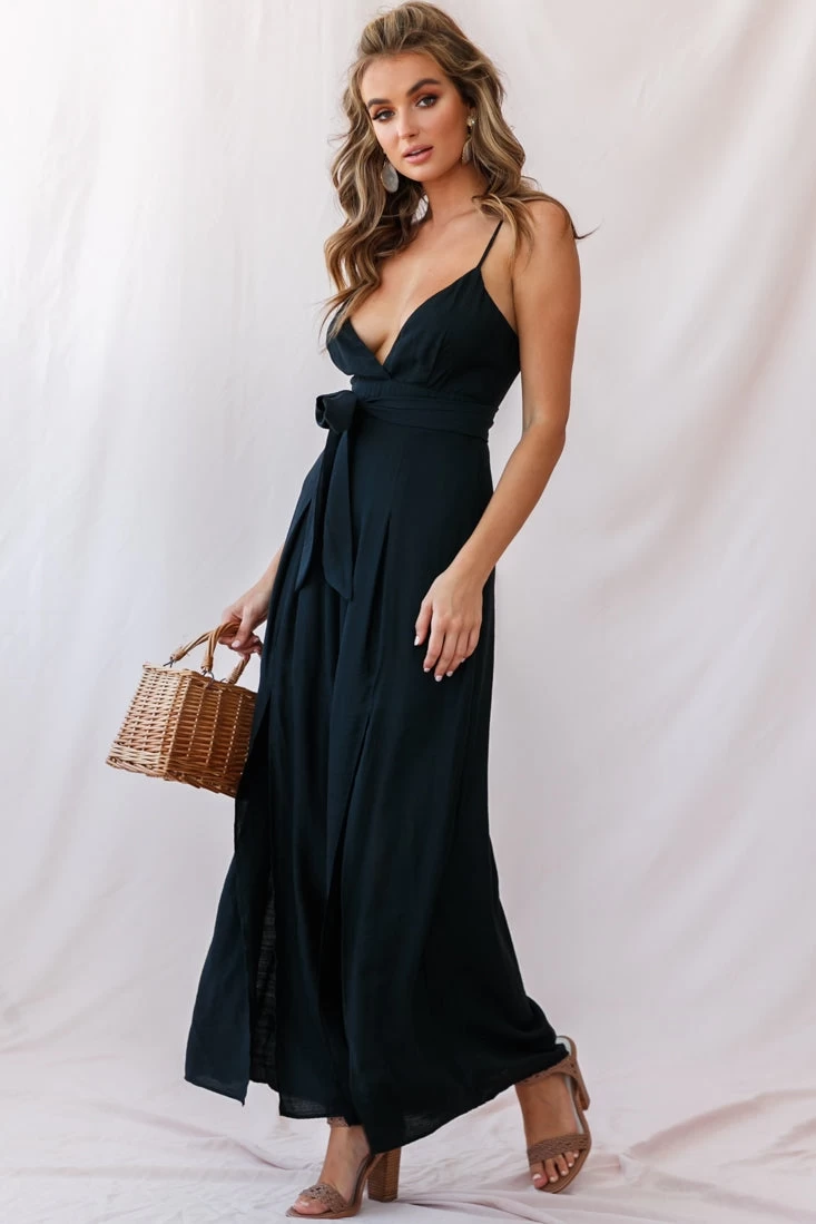 Chic and feminine, this jumpsuit is perfect for strolling the farmer’s markets or a beachside bar, it’s classy, but just the right amount of sexy with it’s V-neckline and breezy splits up the front of each leg. Partially lined, it also features a belt and invisible zipper up the back. Pair with espadrille wedges and a straw tote for a look we are loving.